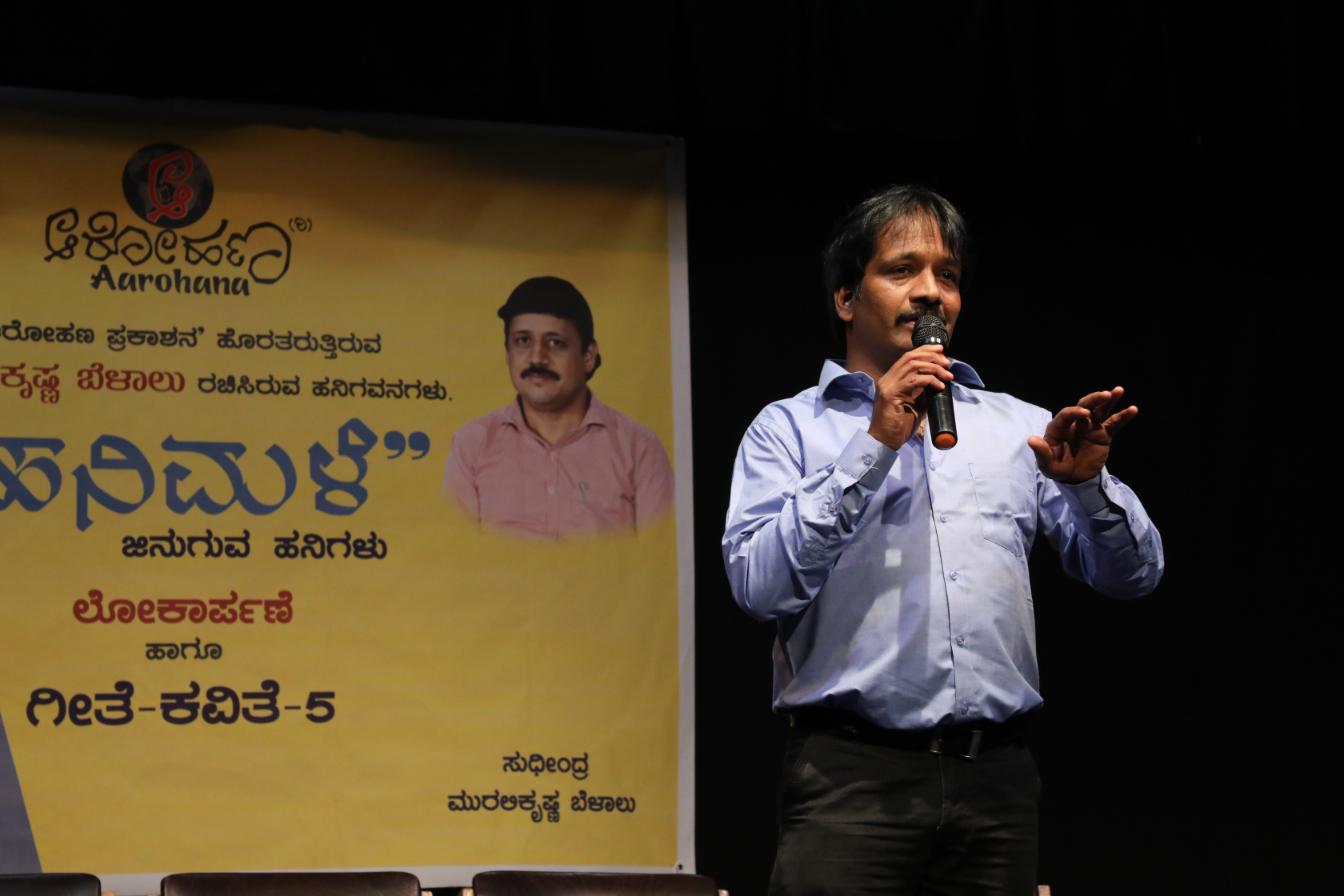 ಗೀತೆ – ಕವಿತೆ -5 : ಕನ್ನಡ ಭವನದಲ್ಲಿ, 21-08-2019 ರಂದು ನಡೆದ ಕಾರ್ಯಕ್ರಮ. ಮುರಲಿ ಕೃಷ್ಣ ಬೆಳಾಲು ರಚಿಸಿರುವ ಹನಿಗವನದ ಪುಸ್ತಕವನ್ನು “ಆರೋಹಣ ಪ್ರಕಾಶನದ” ಅಡಿ ಬಿಡುಗಡೆ ಮಾಡಲಾಯಿತು. ಕಾರ್ಯಕ್ರಮದಲ್ಲಿ ಸಾಹಿತಿ ಜರಗನ ಹಳ್ಳಿ ಶಿವ ಶಂಕರ್ ಹಾಗೂ ಡಾ. ವಸುಂಧರ ಭೂಪತಿ ಅವರು ಭಾಗವಹಿಸಿದ್ದರು.