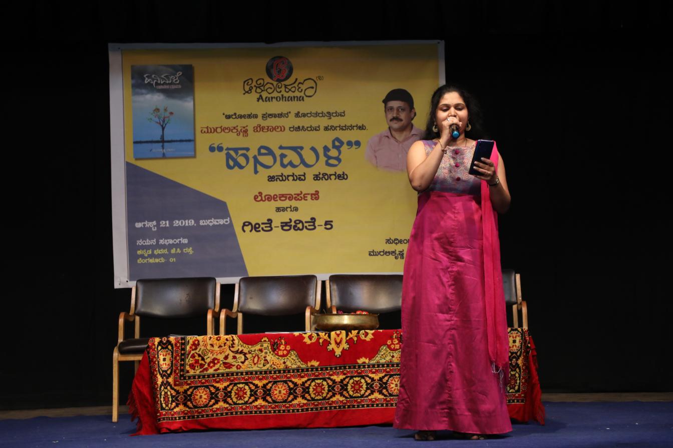 “Geethe – Kavithe – 5” : Program held at Kannada Bhavan on 21-08-2019. Hani gavanas written by Murali Krishna Belalu was leased under “Arohana Prakashana”. Eminent poet Jargana Halli Shiv Shankar and Dr. Vasundhara Bhupathi participated.